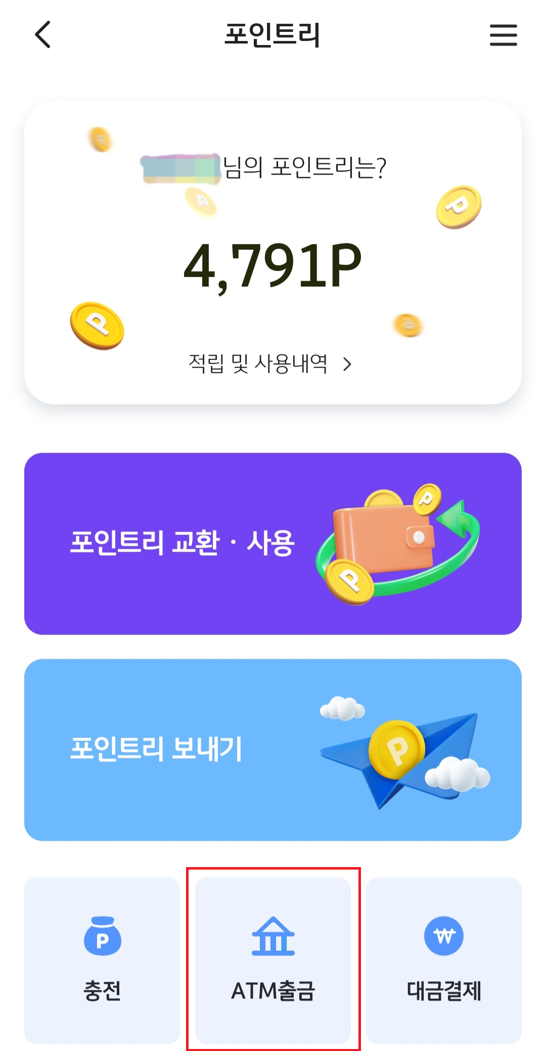 3. 포인트리는 ATM기를 통해 바로 출금도 가능한데 10,000포인트 이상이 쌓였을 때만 출금이 가능합니다.