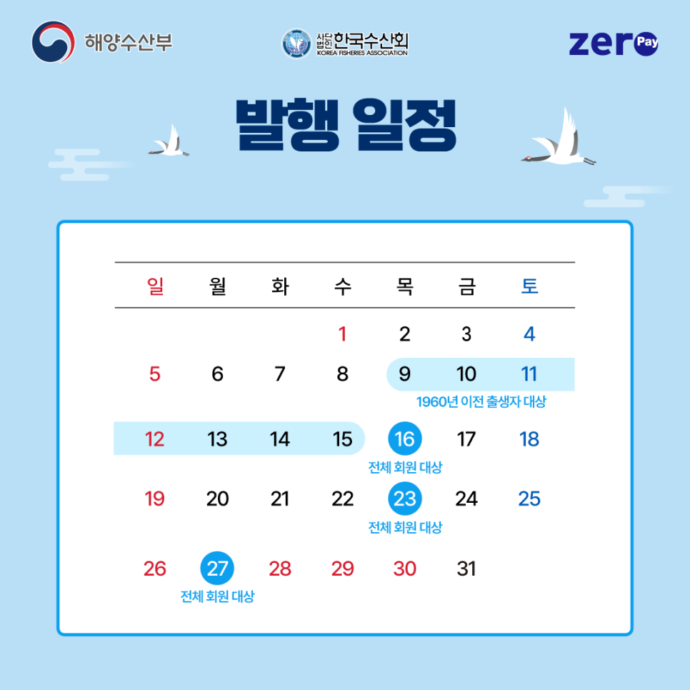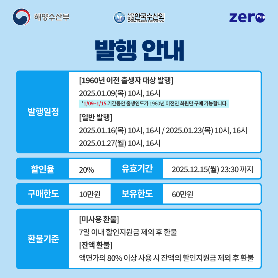 매월 첫 주 목요일 ~ 다음 주 수요일까지는 1960년 이전 출생자(1960년생 포함)만 수산대전 상품권 구입이 가능합니다.